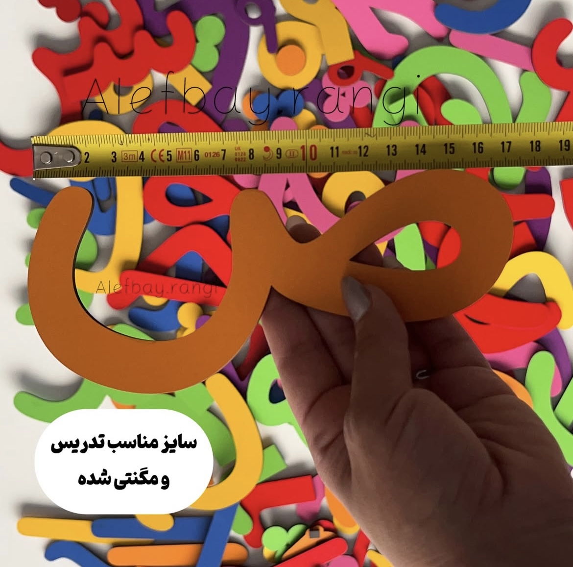 «الفبا۱۶سانتی چوبی »متریال این کار چوبMDFسه میل است پشت کار اهنربا متصل شده است و به تخته مغناطیسی متصل میشود مناسب آموزش در کلاس پرجمعیت و قابل دید در کلاس۴۰نفره است برای تدریس خصوصی نیز طرفدار دارد با دوام و با کیفیت است رنگبندی رندمی و۸رنگ است کار تمیز و مرتب است.