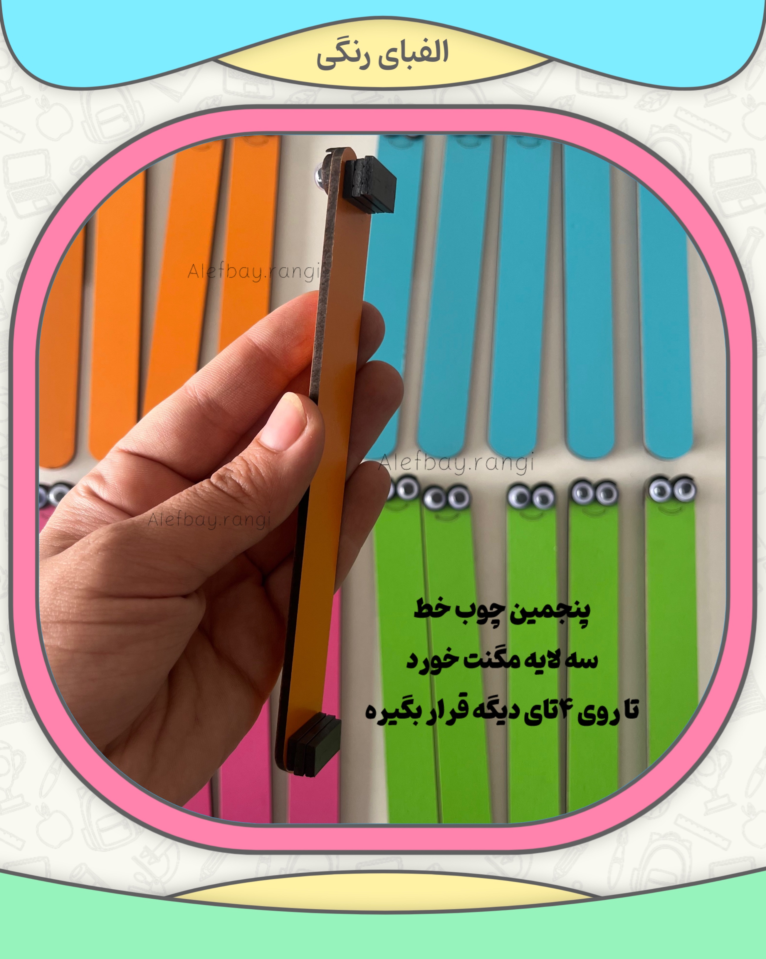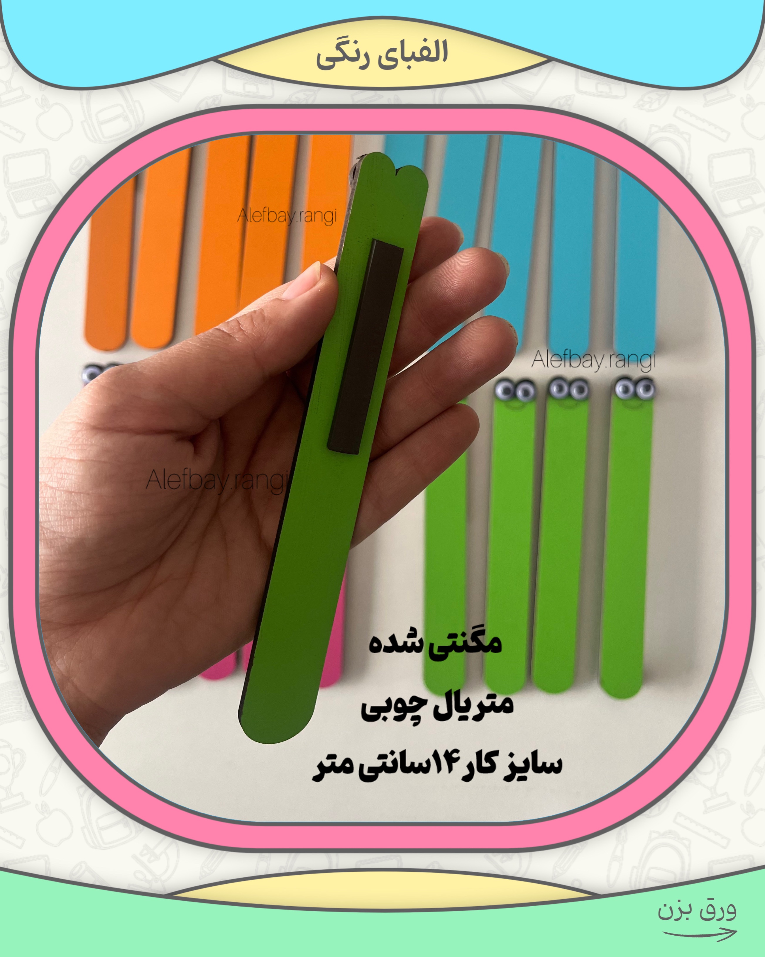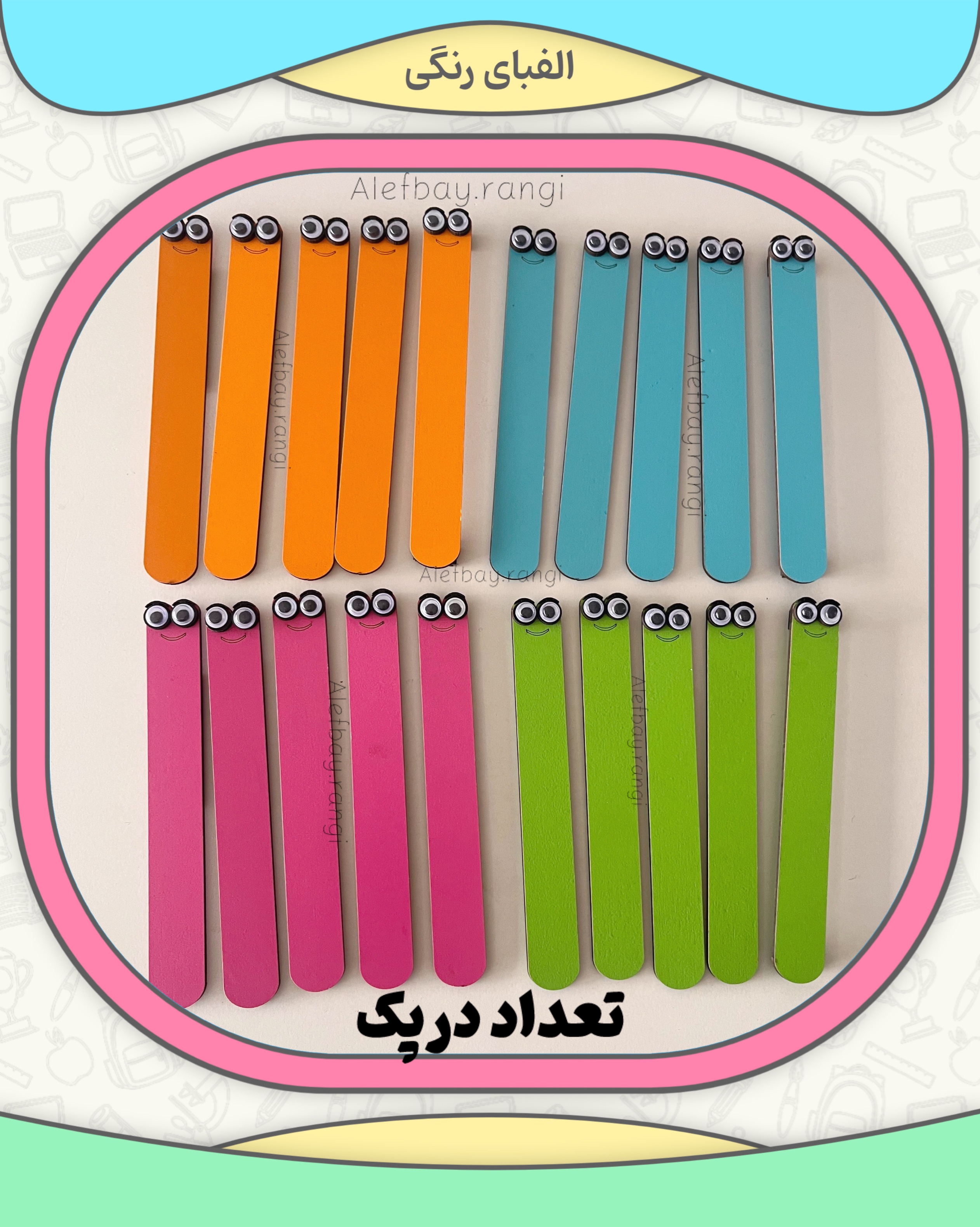 چوب خط فانتزی شامل۲۰تا چوب خط با چشم های متحرک است ارتفاع کار۱۴سانتی متر متریال کار چوبMDFاست پشت کارها مگنتی شده است وپنجمین چوب خط طوری مگنتی شده است که روی چهار چوب خط قبلی بایستد.قابل دید در کلاس پرجمعیت است و با۴رنگ پک میشود