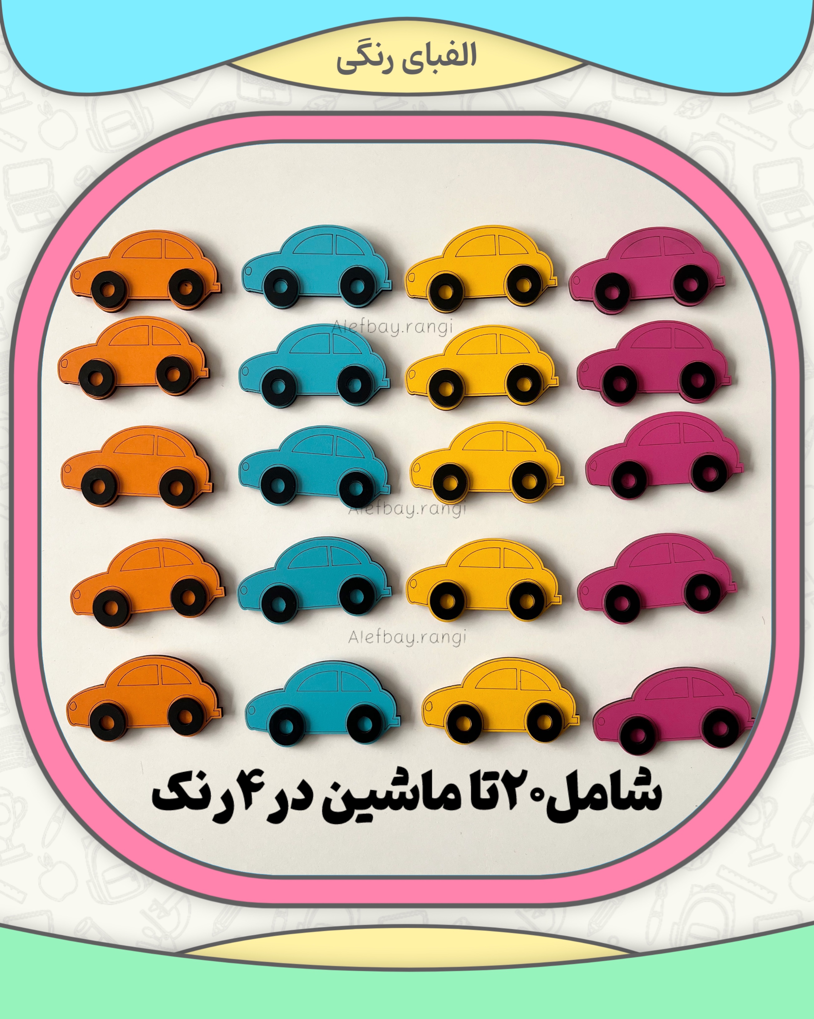 این پک شامل۲۰تا ماشین در۴رنگ است پشت تمام قطعات مگنتی شده است جنس کار چوب MDFاست سایز کار۷سانت و نیم میباشد.جهت آموزش اعداد شمارش الگویابی جمع تفریق حل مسئله مقایسه و…بسیار مورد توجه و جذاب برای دانش آموزان پسر است.همچنین میتوانید با تهیه ۲یا ۳بسته از این پک ضرب و تقسیم رابه خوبی برای دانش آموزان تفهیم کنید.