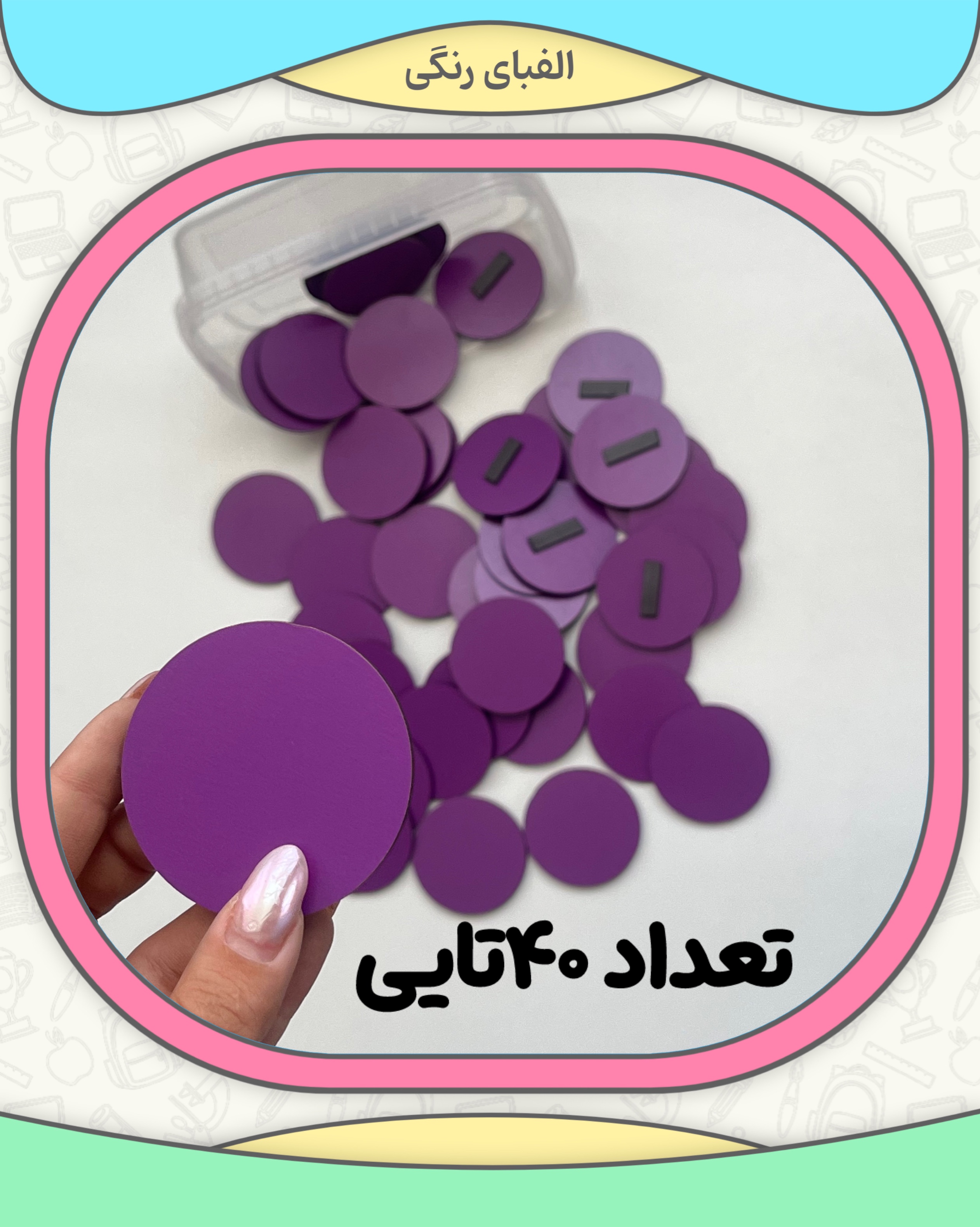 این پک شامل۴۰دایره یک رنگ است جنس کار ام دی اف و پشت کار مگنتی شده است.